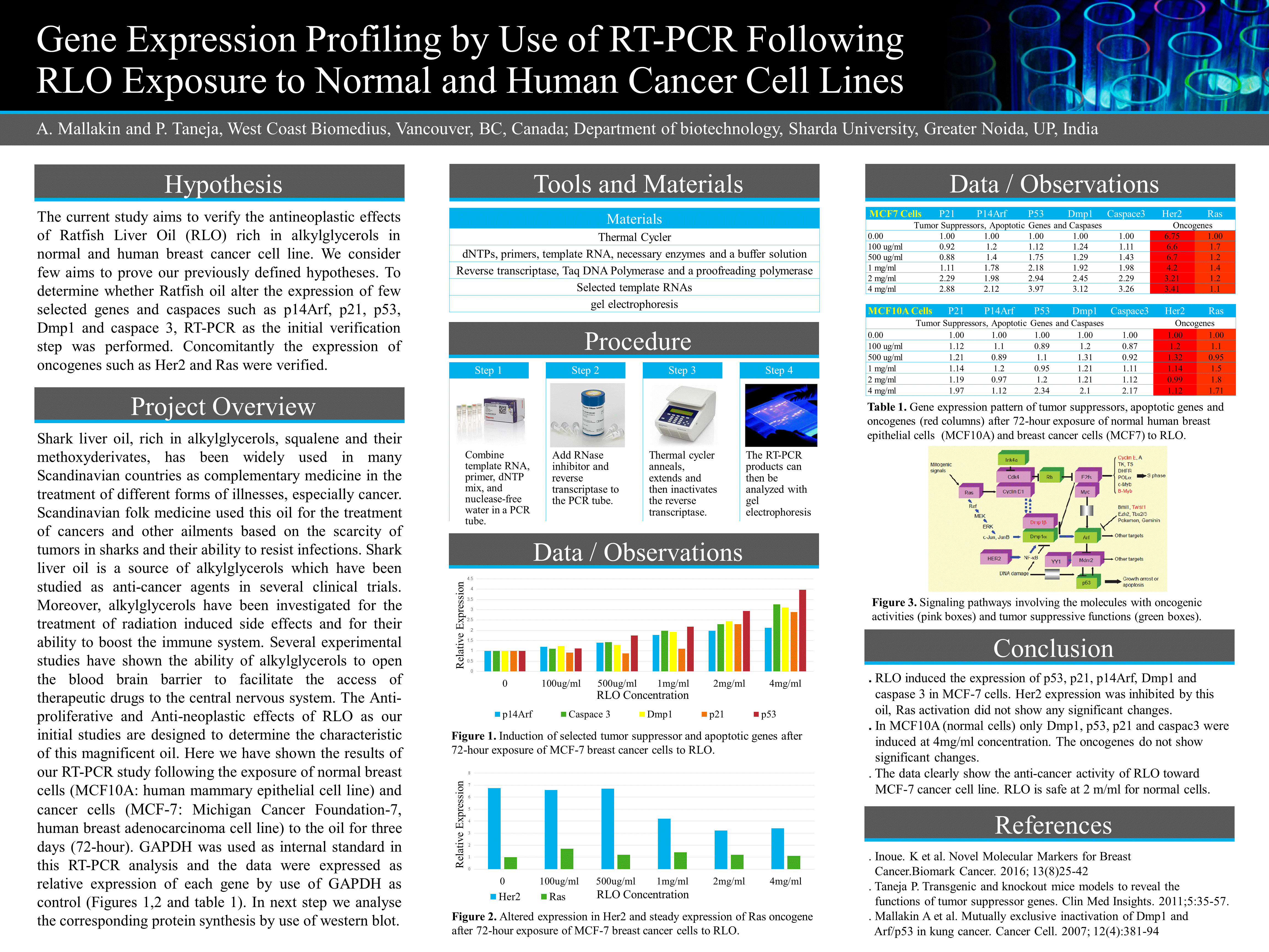 4/16 Gene Expression Profiling through RT-PCR Analysis. Initial study shows induced expression of tumor suppressors and apoptotic genes in breast cancer cell line after RLO exposure for 72-hour. Collaboration with Department of biotechnology, Sharda University, Uttar Pradesh, India (Data Page).